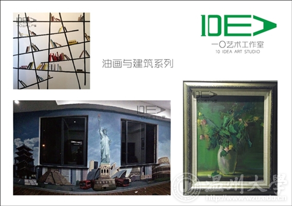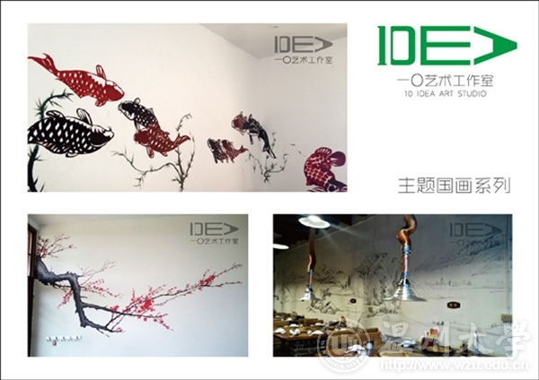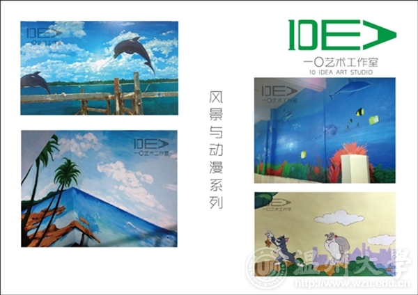 团队名称:一〇艺术工作室 负责人:吕舒宁 联系电话:18367810822 工作室简介 “一〇”艺术工作室成立于2013年,由麻豆视 油画、国画以及环艺专业的几位热血青年组成。以墙绘艺术创作,定做油画、国画为核心。秉承“一”是最简单的开始,“〇”是无限大的创意。我们只为用色彩点亮客户的艺术生活,为此我们以初心——永不止步。 工作室成员 吕舒宁、蒋成杰、郭龙、朱雄辉、陈情、林瑞恬、黄磊、顾天成、陈伟伟 经营业务范围 1.油画国画风景、人物类定做 2.室内室外墙体艺术彩绘 3.绘画作品临摹临摹(包括油画、国画、书法等) 4.平面设计 作品展示 创业感想 我们是大学生中的沧海一粟,我们曾彷徨,为不定的未来着急。绘画从来都是高贵的玩具,年轻的我们还拿不起。某个契机,看到了专业的缩影——墙绘。我们是专业的画手,我们有最新颖的想法,我们愿用热血呈现精彩的视觉享受。 细看生活不难发现随着经济的发展,人们开始追求上层建筑的享受,而绘画艺术必将广泛的进入我们的生活,已经成为一种生活的方式。我们知道翅膀硬的老鹰才能飞的更高,所以我们将明确目标,实事求是,执着追求,最终可以让所有人的生活变得更加美好。