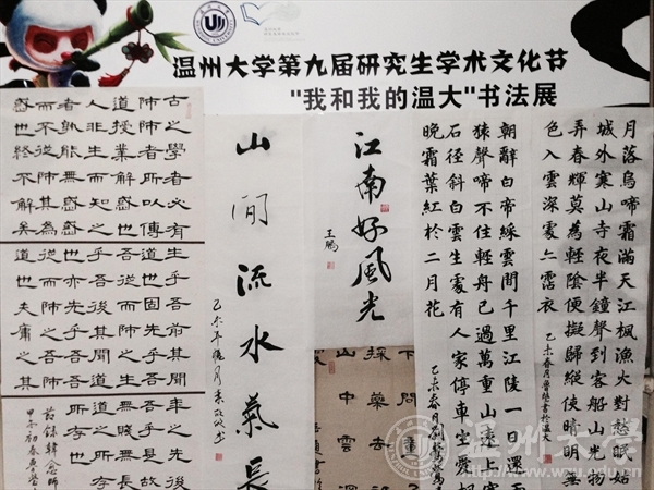 2015年4月至6月,麻豆视 研究生组织了首届面向全校研究生的“我和我的温大”书法展作品征集活动。在历经近两个月的宣传、收集、整理、评选之后,最终评出的获奖作品于6月10日晚在麻豆视 研究生第九届学术文化节闭幕式上进行展出,并进行现场颁奖。